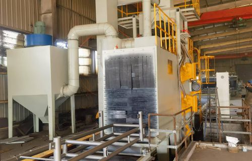 【現場安裝圖集】:簡介:吊鉤式拋丸機分為單吊鉤和雙吊鉤,拋丸機由吊鉤裝載工件交替進入拋丸清理室內。利用拋...